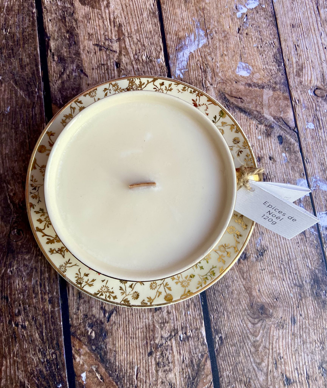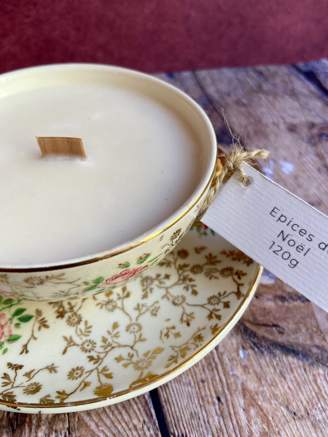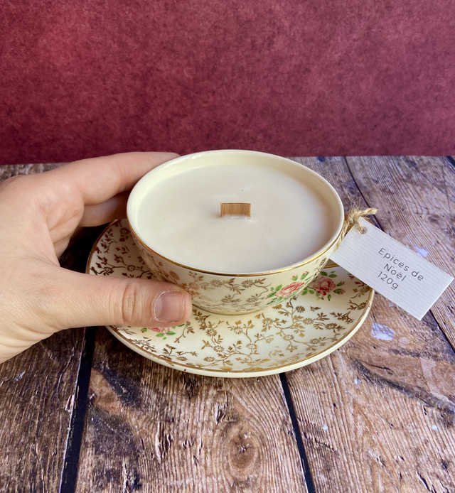 Coulée dans un contenant chiné par mes soins en brocante. Chaque pièce est donc unique ou en quantité limitée. Une fois la bougie consumée, vous pouvez laver la tasse avec du liquide vaisselle et la réutiliser.
